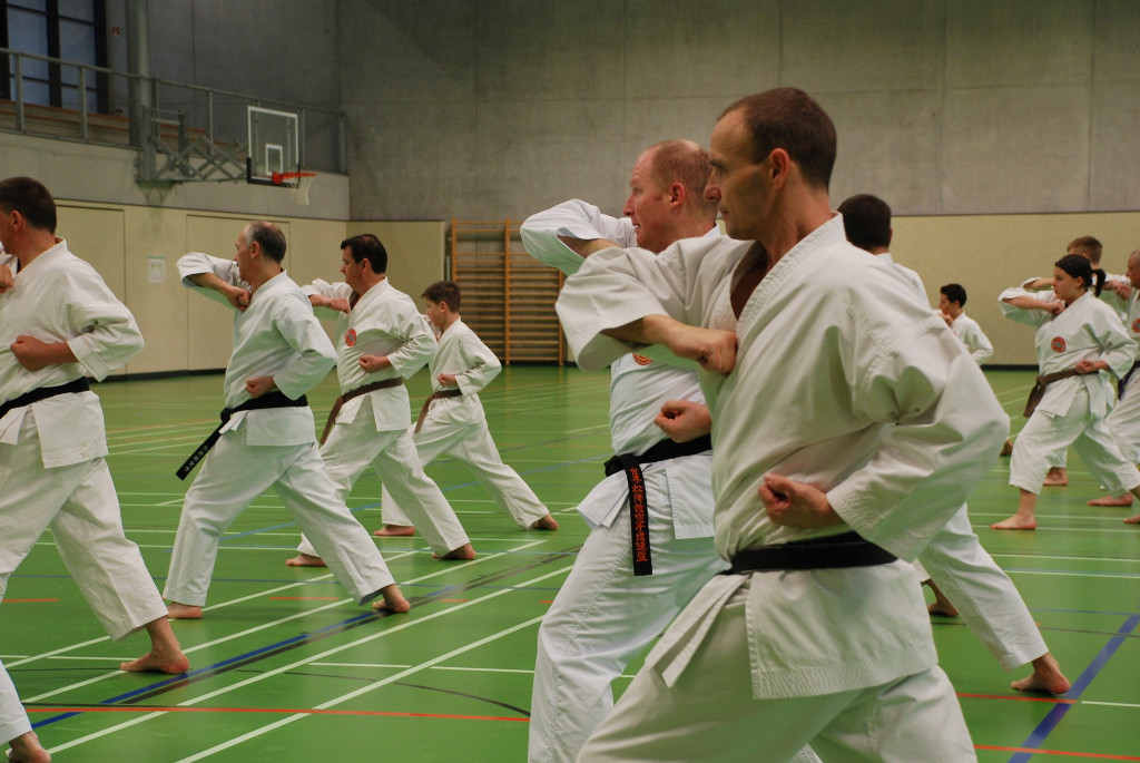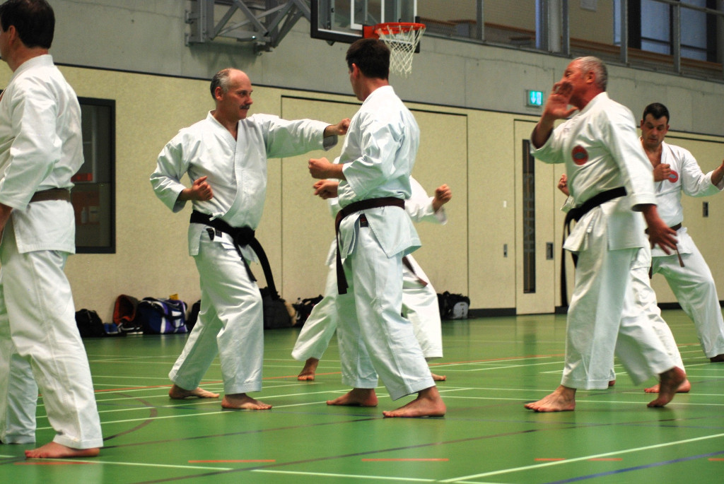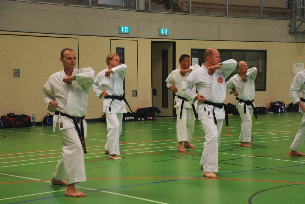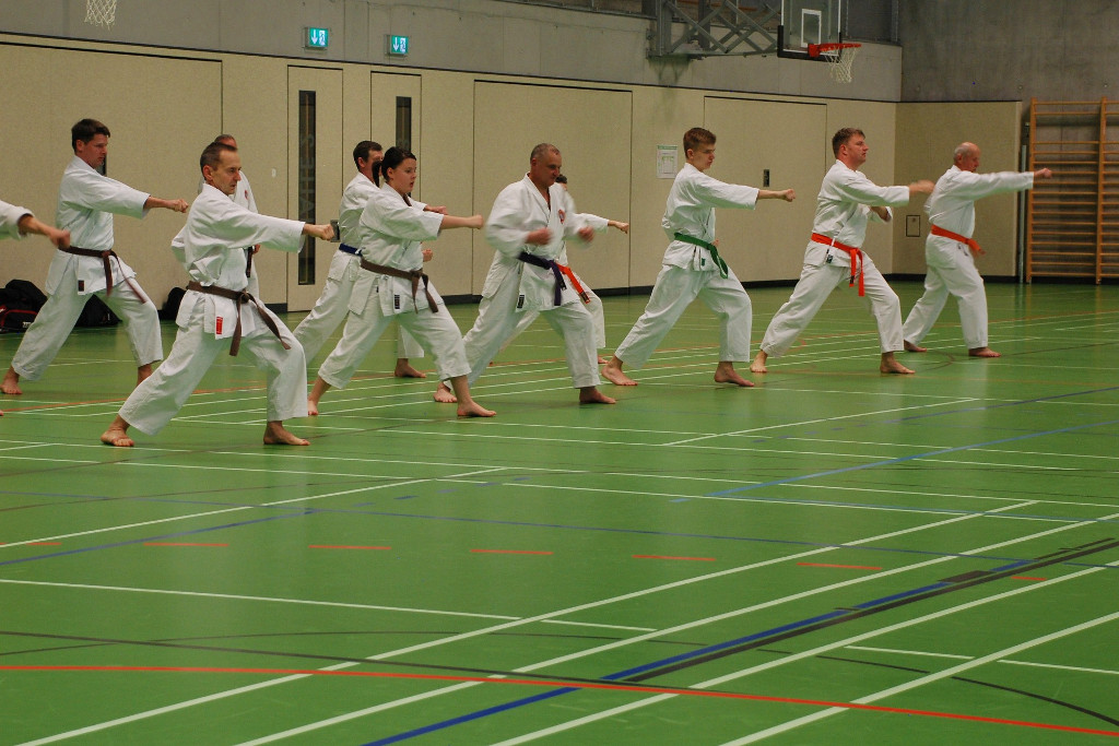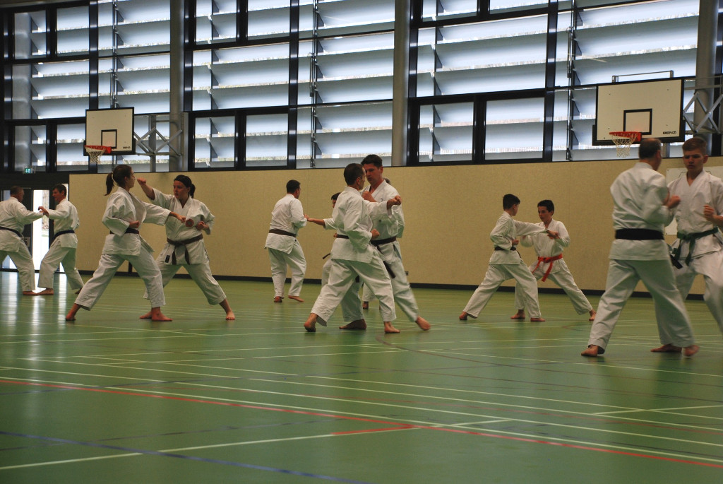 Anspruchsvoll sowohl für Körper und Geist. Da Karate nicht nur aus einzelnen Techniken und Vorwärts- und Rückwärtslaufen besteht, ließen die beiden Senseis die Teilnehmer wieder viele Kombinationen und Übungen aus Kihon und Kumite ausführen. Ziel ist es die Flexibilität und Auffassungsgabe des Karateka zu trainieren. In den anschließenden Kata-Sessions ging es wiederum um Korrektheit und Verständnis bei der Ausführung der Techniken.